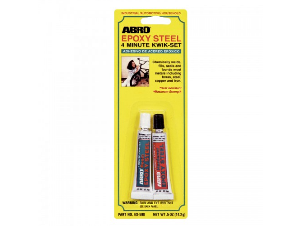 Клей ABRO содержит эпоксидные смолы и измельченную сталь. Применяются эпоксидные клеи для химической сварки, заполнения, герметизации и склеивания дерева, пластика и большинства металлов, включая латунь, сталь, медь, железо, и т. п. Эпоксидный клей надежно склеивает и обеспечивает хороший внешний вид. Устойчив к бензину, антифризу и большинству растворителей. Эпоксидный клей может применяться для сломанных велосипедов, растрескавшихся картеров коробки передач, тормозных колодок, всасывающих труб, поврежденных шпоночных канавок, трещин в обшивке, растрескавшейся батареи, бензобаков.