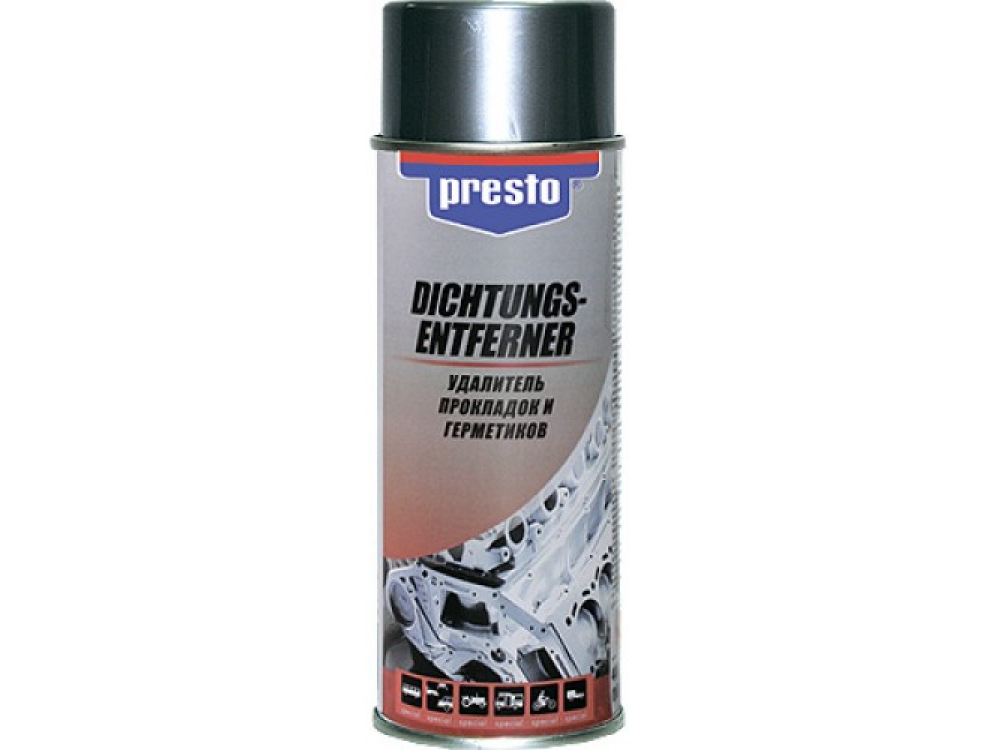 Высокоэффективный Удалитель прокладок и герметиков PRESTO для быстрого и легкого удаления прокладок (в том числе тех, которые затвердели под воздействием высоких температур), герметика, клея, краски, масла, жира и т.д. Специальные добавки гарантируют длительный эффект. Может применяться для изделий из металла, дерева, керамики, стекла, полиэтилена и полипропилена. Эффективен на вертикальных поверхностях.