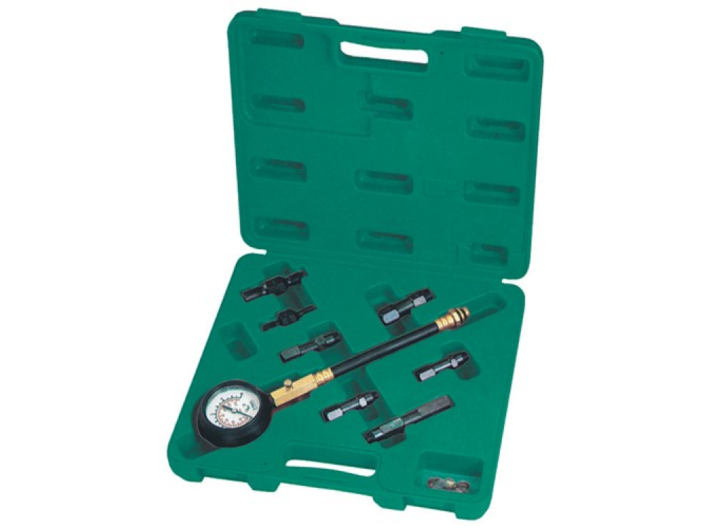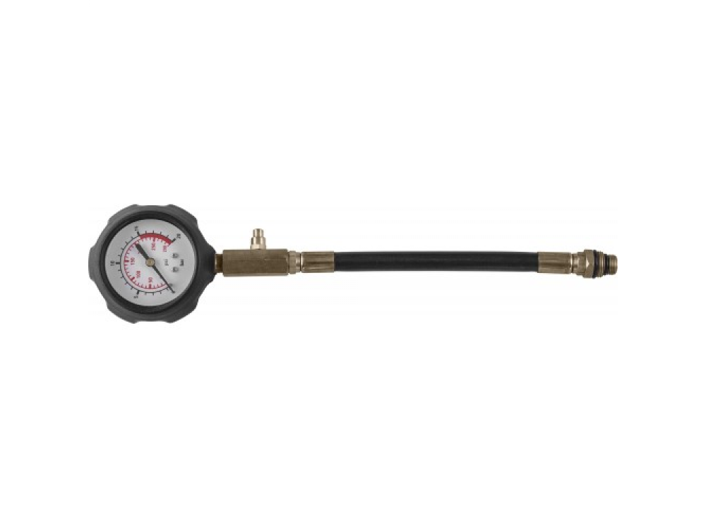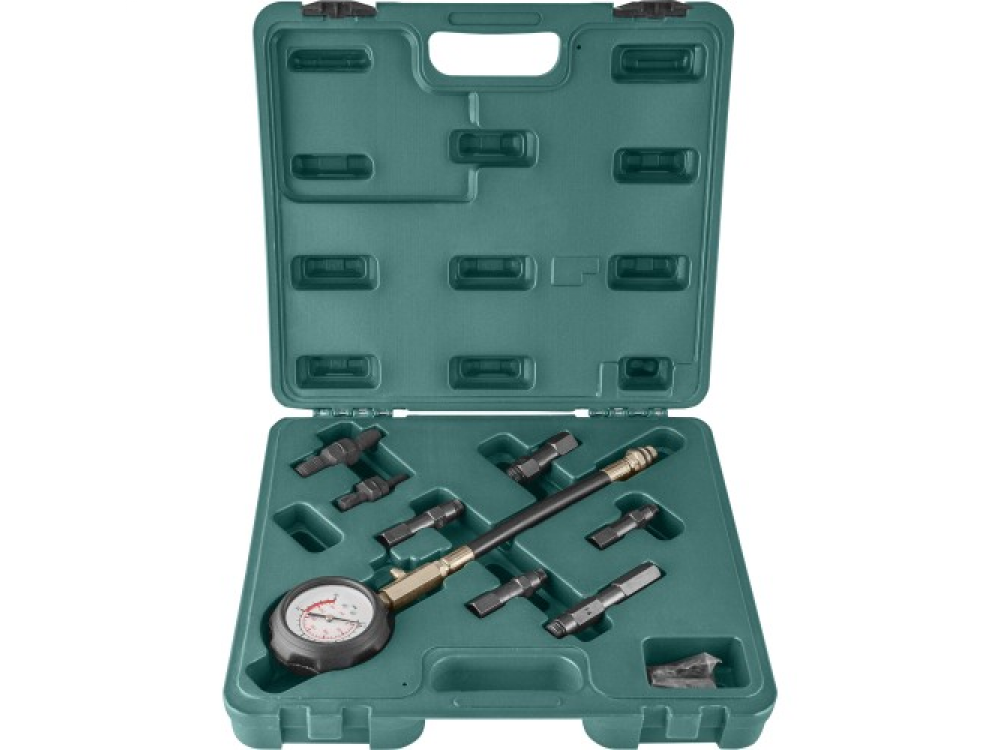 Универсальный компрессометр бензиновых двигателей, применяющийся для точной диагностики работоспособности и обнаружения неисправностей цилиндро-поршневой группы и газораспределительного механизма двигателей автомобильной, тракторной, садовой, мотоциклетной техники. Прибор комплектуется большим 83-мм манометром в ударопрочном, обрезиненном корпусе. Соединительный шланг имеет адаптер-переходник для свечных отверстий М14 и М18. Дополнительно, компрессометр комплектуется удлинителями переходниками для диагностики двигателей с осложненным доступом к свечным отверстиям и соединения с "нестандартными" резьбовыми свечными отверстиями М10, М12, метчиками для восстановления резьб М10,М12,М14,М18 и комплектом уплотнительных колец для соединений адаптеров.
