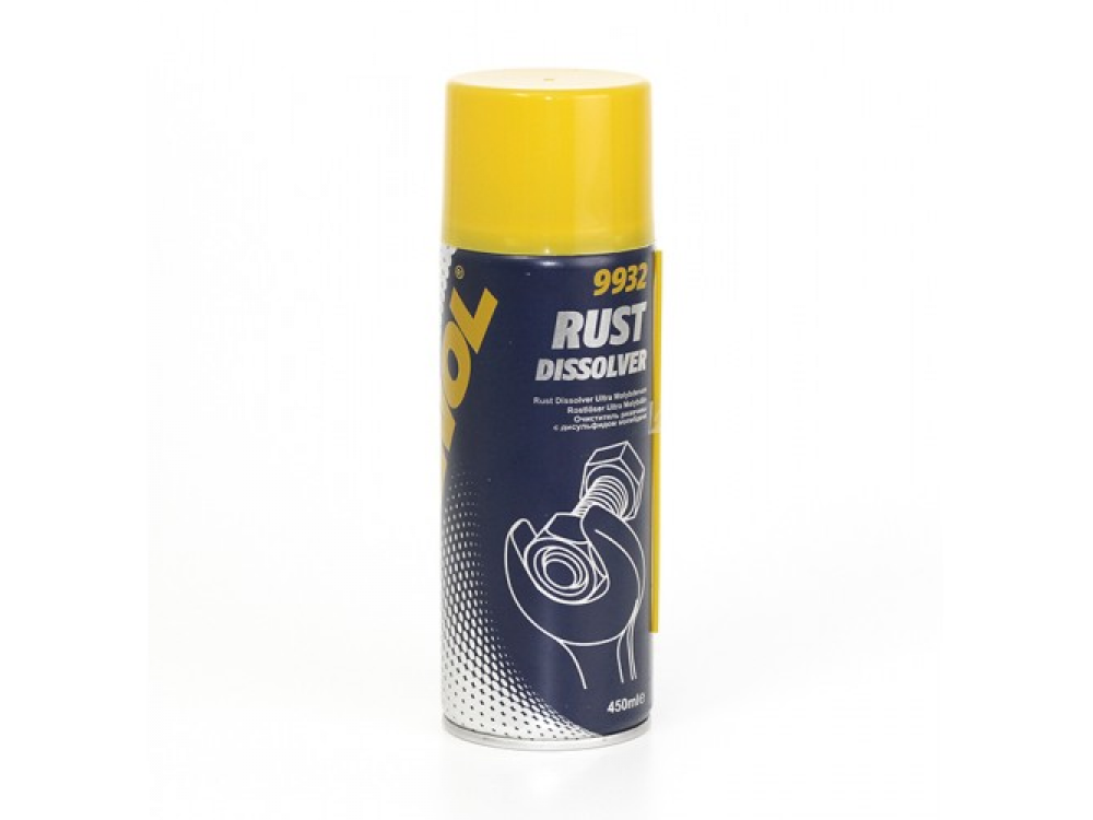 MANNOL Rust Dissolver – эффективное средство для борьбы с ржавчиной, обладающее отличными антифрикционными свойствами. Предназначено для широкого применения во всех движущихся узлах механизмов. Благодаря наличию в составе быстропроникающих растворителей мгновенно освобождает от ржавчины резьбовые соединения. В течение длительного времени способствует легкости хода и устраняет скрип. Вытесняет влагу с поверхности рабочих частей свечей зажигания, способствуя облегчению запуска влажных двигателей. Обеспечивает низкое трение благодаря наличию прочной смазки на основе дисульфида молибдена. Этот продукт не оказывает разрушающего воздействия на резину и пластмассы.